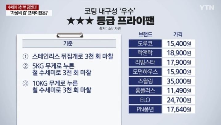 인지도높은 가격 비싼 유명 브랜드 테팔 제품보다 내구성이 좋다니 주부님들 상당히 충격이시겠습니다. 철수세미를 이용한 내구도 실험 중 우수 제품 브랜드는 오히려 저가형의 저렴한 가성비제품을 만드는 홈플러스, ELO, 그리고 도루코 등이었습니다.